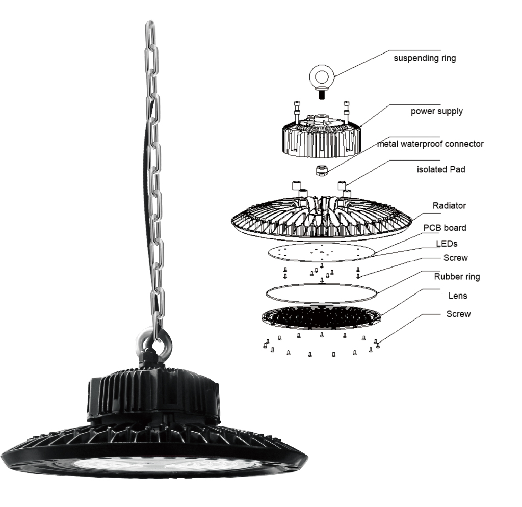 | SL-UFOA00-150Y-XXXX-B | 150W | 28500 | Φ400*H185 | L440*W440*H195 | 6.2kg |