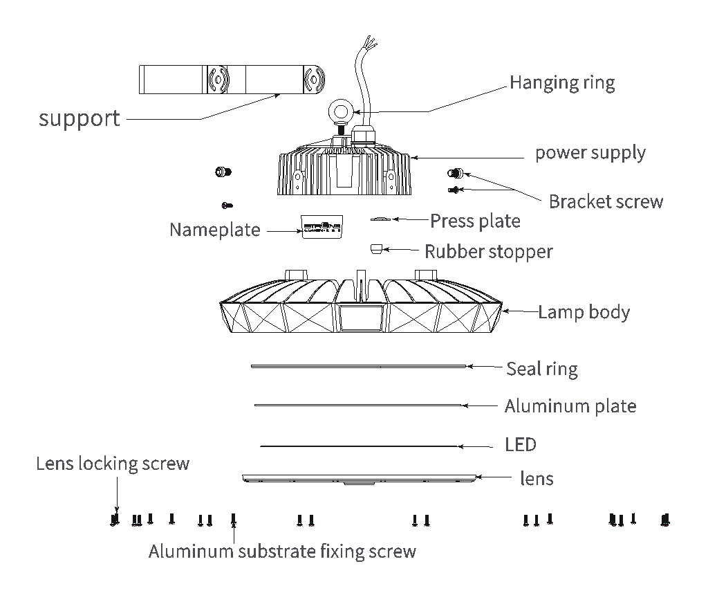 | Model name description: SL-UFOA00-300Y-XXXX-C. “SL” indicates the name of company producing the product; “UFO” indicates the product is a LED High Bay; “A00” indicates the voltage of the product; “300” indicates the power of the product; “Y” indicates the colour temperature of the product. Where the “Y” can be N=3000K, M=3500K, L=4000K, K=4500K, C=5000K, H=5700K represents color temperature; “XXXX”Where XXXX represent light angle, it can be R060,R090,R120; “C” indicates the shape size; Beam Angle ![]() 60° 90° 120° Installation ![]() Structure drawing |
